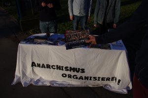 Gestern führten Genoss*innen der Anarchistischen Gruppen Essen und Dortmund einen ersten unangemeldeten Infostand im Dortmunder Westpark durch. In diesem Park wird auch der Startpunkt unserer Demonstration sein. Bei allerbestem Infostand-Wetter verteilten wir in über einer Stunde Flyer und machten auf unsere Demonstration aufmerksam. Es gehört ja mittlerweile quer durch alle politischen Spektren zum guten Ton, in Aktionsberichten stolz zu verkünden, wie erfolgreich dieser und jener Infotisch gewesen sei. Dennoch müssen wir wirklich sagen, dass wir gradezu überrascht davon waren, wie durchgehend positiv die Rückmeldungen auf unseren Tisch an diesem Tag im Westpark waren. Wir erleben es häufig, dass anarchistische Aktionen und Öffentlichkeitsarbeit, wenn sie selbstbewusst vorgetragen werden, alles andere als negativ von den Menschen aufgenommen werden. Es ist leider ein weit verbreiteter Irrglaube, auch unter Anarchist*innen selbst, dass es innerhalb der Gesellschaft ja eigentlich nur Ablehnung gegenüber unseren Ideen gibt und die “normalen Leute” von der Straße nichts von uns wissen wollen. Es ist immer ein gutes Gefühl, sich wieder und wieder vom Gegenteil zu überzeugen. Heute haben wir besonders großen Zuspruch erfahren.