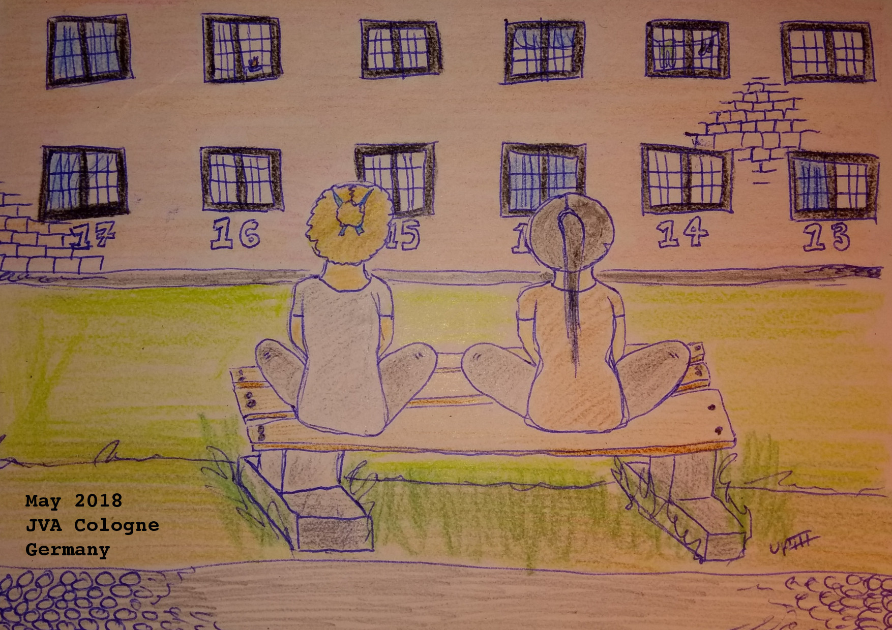 Conversation about Veganism in Prison. Drawing. 5/18Note 25/5/18: Thankfully, I have a vegan friend here and we’ve had several little discussion about how difficult it is to be vegan here, which is good because it makes me feel less strange (“why don’t you eat meat or cheese?”) and I imagine we will have many more. She doesn’t eat vegan in prison (it is very nearly impossible, and I’m really feeling the lack of variety body wise, I always feel lethargic), but tries to be as vegetarian as possible. I guess freegan, because whatever we are given we either eat or throw away. If you’ve read the “menu letter” I wrote about what I ate and usually eat, it sucks here food wise. I’m also starting to cut bread out of the things I eat as it’s making me sick. Also the soup. I have no more chocolate. White rice, boiled potatoes and the once or twice a week fruit or vegetable, and cold coffee. What if there is butter in the rice? Hmm.