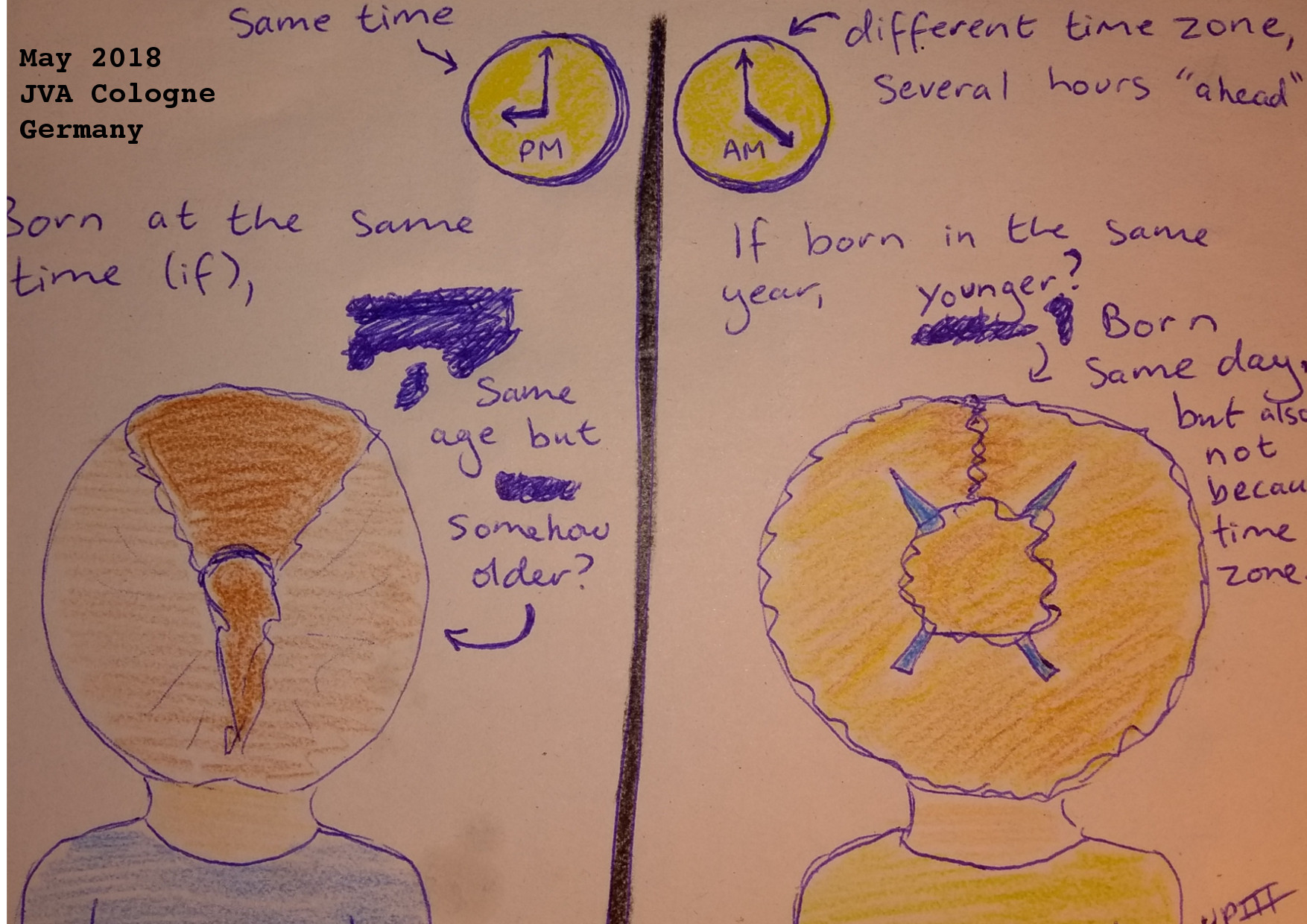 Time Zone Birthday Curiosity. Drawing. 5/18Note 25/5/18: I was thing about a conversation I had in the forest. I didn’t draw it very clearly but I wondered about this person’s birthday. If we were born in the same year, who would be older? My time zone is a different (or time zone for my birth anyway). So it would be them, born the “day before”. But. What if they where born late at night, and me early in the morning or other way round? Time zones say they are older/younger, but logically I/they have existed for longer, born the equivalent of early evening in their time zone. I hope this makes sense. I have to ask when I’m free, I want to know if we were born on the same day because of time zone weirdness. If there is really a day between us. I hope I remember to ask! <3
