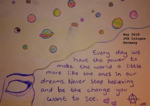 Bono. Drawing. 14/5/18Note 23/5/18: I don’t have much to say, I just like this quote. If my life is a book, I want to look back and be proud of choices I made. I want other people to think “I can do that too” like I have. I’m in Germany because I thought “why not? If not me, who? If not now, when?” cliché quote I know but I’m a better person from meeting all of you, from being where I am. If I didn’t see you and think “I can do that too” I wouldn’t be here. I ope my stay here gives someone out there the same inspiration, there isn’t much to fear with so many people supporting you.