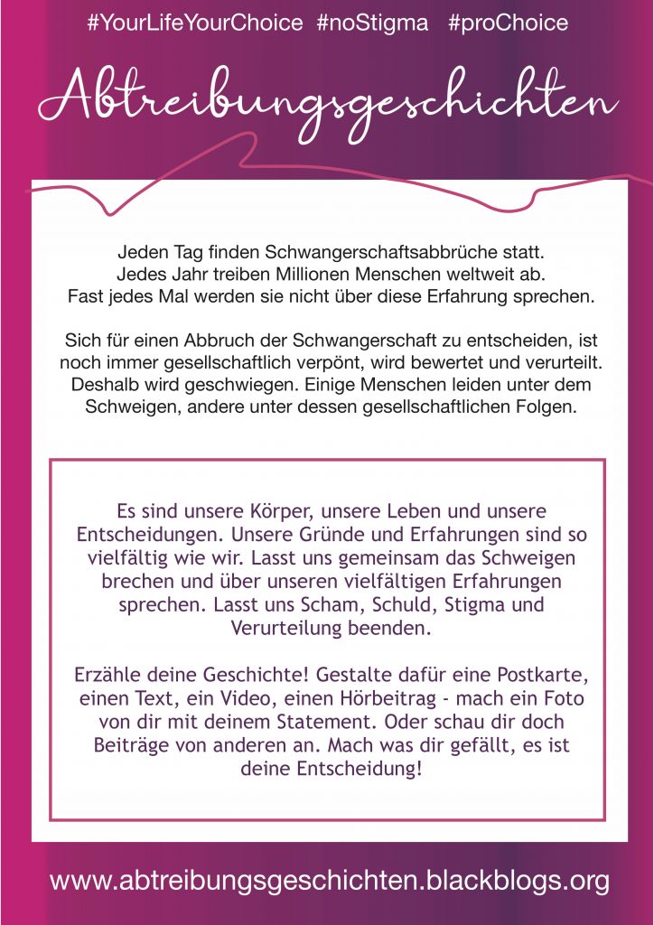 Wir sagen: genug! Lasst uns gemeinsam das Schweigen brechen und über unsere Erfahrungen sprechen. Lasst uns die Erfahrungen so selbstverständlich mit Anderen teilen, wie es die Entscheidung für Abtreibung sein sollte. Lasst uns Scham, Schuld, Stigma und Verurteilung abschaffen.