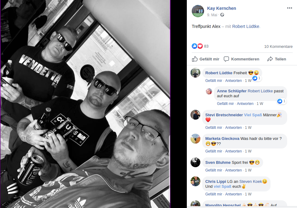 Zu eben solchen gewaltaffinen Rechten aus dem BFC-Umfeld zählt auch die Clique um Steve Koek, der am 09.05.2020 und 16.05.2020 u.a. mit dem Neonazi Robert Lüdtke im Umfeld der Proteste anwesend war.