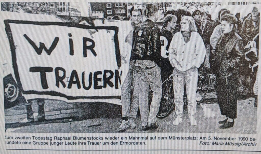 - Am 2.5.1993 wurde eine Bodenplatte am Münsterplatz verlegt, die an den Mord und an Rafael Blumenstock erinnern soll: „Du lebst in unserer Klage, im Herzen stirbst du nicht. Rafael Blumenstock, ermordet am 4.11.1990“ – sowohl Freund*innen als auch Familie forderten damals ein sichtbareres Denkmal