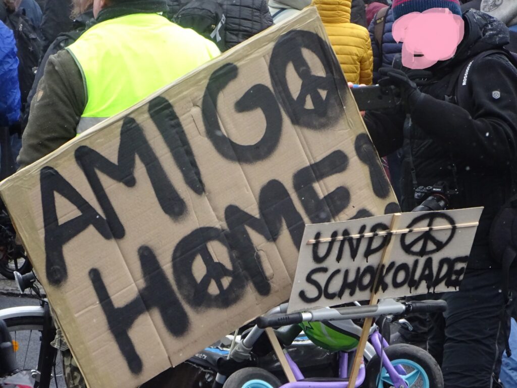 Eine Gruppe Compact-Nazis läuft am Panzer vorbei zur Demo. Als sie am Panzer vorbei laufen, rufen sie „Schande! Eine Schande für Deutschland“ und „Amis raus, Amis raus!“. In den zweiten Ruf fallen gefühlt etwa 200 freundliche Friedensschwurbel ein und rufen ihren Lieblingsslogan aus ganzem Herzen zusammen mit den Nazis.