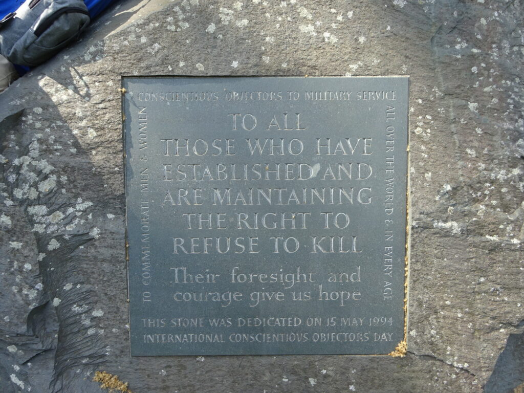Gedenkstein für Deserteure und Kriegsgegner*innen im Park hinter der Hütte der Qqäker*innen.