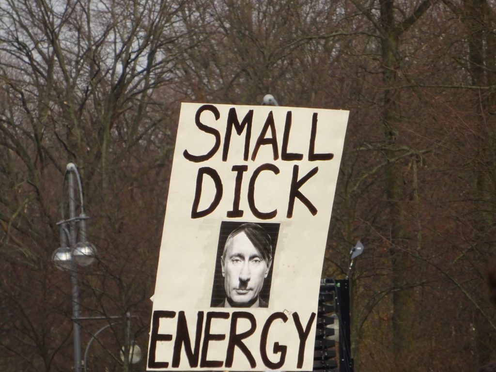 Außerdem sehr beliebt waren Schilder, die sich mit Herrn Putins Gemächt beschäftigten. Uneinigkeit herrschte jedoch, ob dieses nun sehr groß oder doch eher zu klein sei. Mehrere Menschen nutzten dies auch für homophobe Darstellungen.
