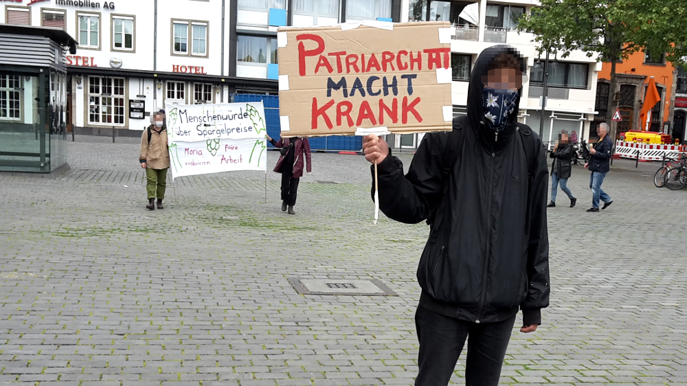 Neben dieser Versammlung von etwa 20 Teilnehmer*innen und ebensoviel Zuschauer*innen, fanden im Kölner Stadtgebiet auch mehrere andere Protestaktionen statt, z.B. vor der Uniklinik und am Roncalliplatz, aber auch in Kalk und Deutz. Auf dem Heumarkt, wo normalerweise die Abschlusskundgebung der Gewerkschaftsdemo stattfindet, versammelten sich etwa 50 Linke, überwiegend autoritäre Staatskommunist*innen. Hinzu gesellten sich etwa 20 rechte Corona-Leugner*innen aus esoterischen Verschwörungskreisen, die nur teilweise auf Ablehnung stießen.