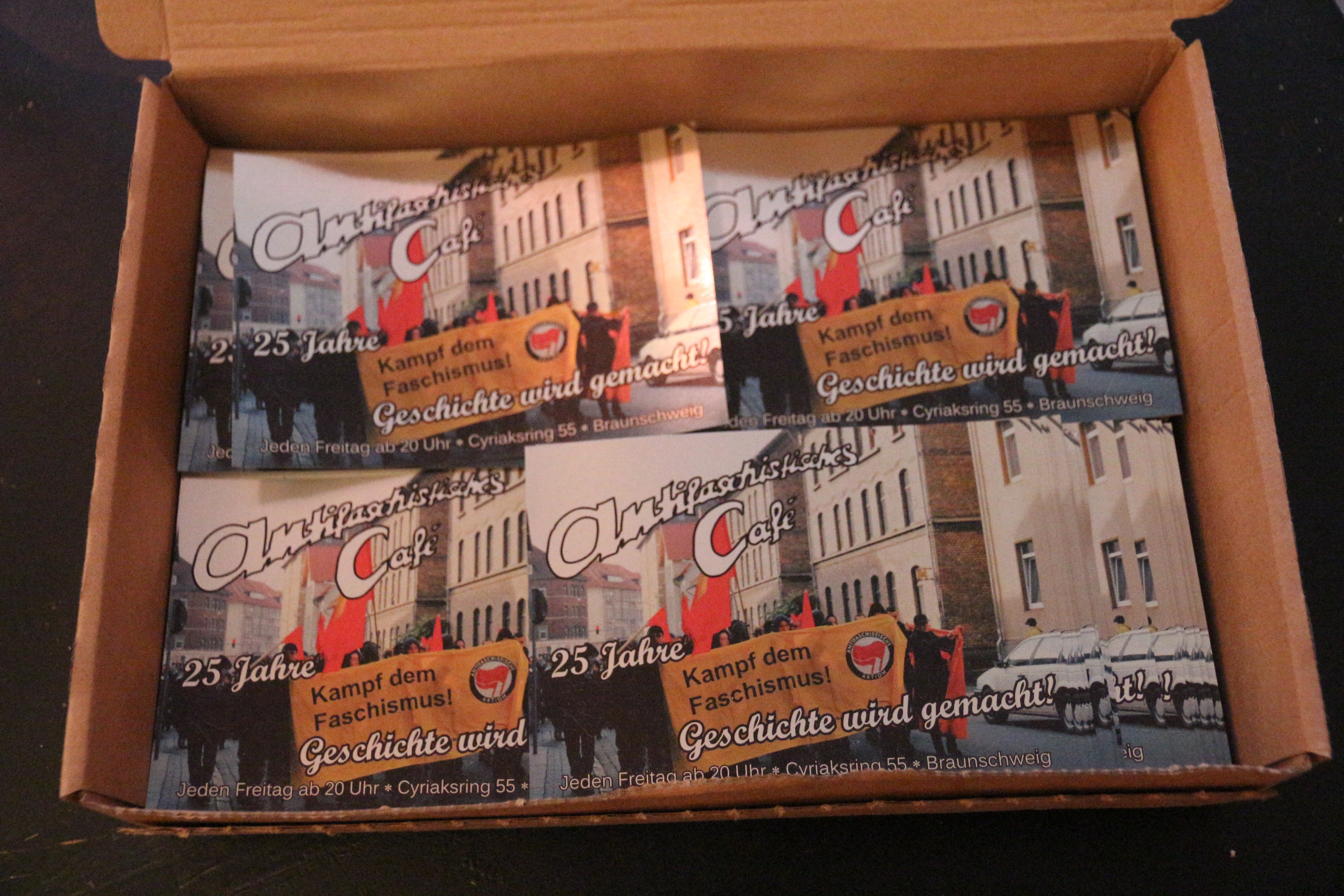 Am letzten Wochenende feierte das Antifaschistische Café sein 25-jähriges Bestehen mit einer Party. Seit 1990 ist das Café im Cyriaksring 55 Veranstaltungsort und Treffpunkt für antifaschistisch interessierte und engagierte Menschen. Seit 25 Jahren ist das Antifaschistische Café jeden Freitag ab 20 Uhr geöffnet. Neben der Möglichkeit etwas zu trinken und manchmal auch etwas zu essen, finden hier z.B. Veranstaltungen, Diskussionsrunden und Filmvorführungen statt. Die neusten Flugblätter liegen aus, man kann eine große Auswahl an linken und antifaschistische Zeitschriften und Broschüren lesen und Buttons, T-Shirts, Aufkleber sowie andere Dinge des täglichen Demonstrationsbedarfs bekommen.