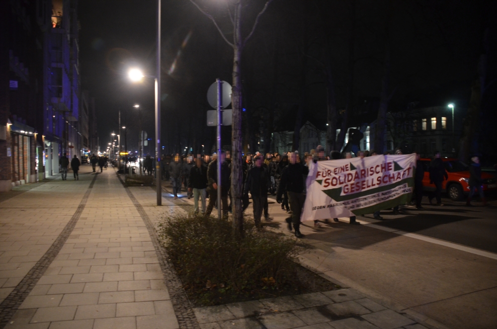 Ganz ohne Neonazipräsenz ging der Abend indes nicht zu Ende. Während die antifaschistische Demonstraton durch die Innenstadt zog, ließ sich eine Gruppe aus Mitgliedern und Sympathisanten des neonazistischen Pseudo-Motorradclubs „Blood Brother Nation“ am Rathausmarkt blicken. Mitglieder dieser Gruppe wurden von der Polizei kontrolliert, als sie vermummt im Umfeld der Demonstration unterwegs waren.