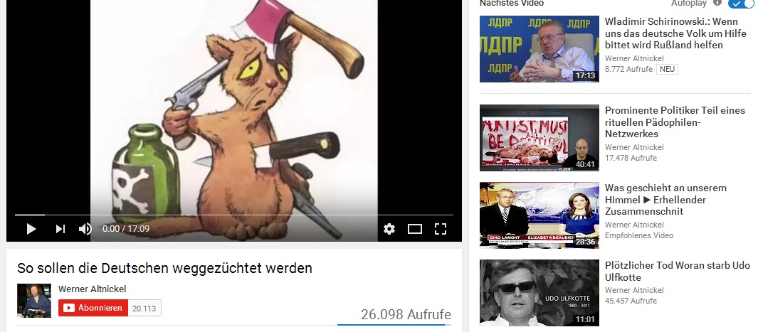 „Er warnt auch vor Masseneinwanderung und der „Vernichtung der weißen Rasse“, neuerdings ebenso vor „36 ultrageheimen Höchstgrad-Logen“, die angeblich die Welt regieren. Zu ihren Mitgliedern gehörten IS-Führer Abu Bakr al Bagdadi und Gerhard Schröder. Ebenfalls bei Youtube verbreitet Werner Altnickel die Theorie, Jüdinnen und Juden hätten nach dem Zweiten Weltkrieg eigene Konzentrationslager errichtet und dort 100 000 Kinder ermordet.“