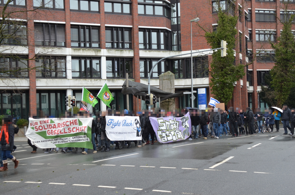 Auch einer der Mitorganisator_innen der antisemitischen und verschwörungsideologischen Oldenburger „Friedensmahnwachen“, Bernd Kahlen, nahm an der Bündnisdemonstration teil. Der Aufforderung zu gehen kam er umgehend nach.