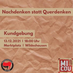 Aufruf von dem MiCOU-Bündnis: „Auch am kommenden Montag ist wieder damit zu rechnen, dass sich so genannte Querdenker in der Wildeshauser Innenstadt zu einem „Abendspaziergang“ gegen Corona Maßnahmen und Impfungen treffen. Und vermutlich werden auch dieses mal wieder Mitglieder der Coronaleugner-Partei dieBasis, AfD-ler und andere Rechte unter ihnen sein.