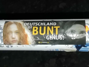 „Der Aufkleber «DEUTSCHLAND IST BUNT GENUG!» von «Ein Prozent für unser Land» (nah).“ Quelle: lkolpatriotinnen
