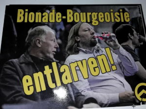 „Der Aufkleber «Bionade-Bourgeoisie entlarven!» mit dem Logo der «Identitäre Bewegung» (nah).“ Quelle: lkolpatriotinnen