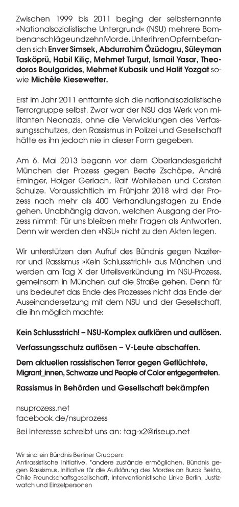 Nach mehr als 4 Jahren NSU-Prozess wird es Anfang nächsten Jahres zur Urteilsverkündung kommen. Zu diesem Tag X in München wird es eine Dauerkundgebung und eine Demonstration geben, für die bundesweit mobilisiert wird.