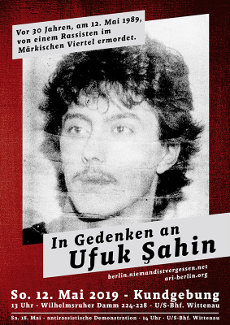 Am 12.05.1989 wird Ufuk Şahin, ein 24-jähriger Berliner, Vater eines 2-jährigen Sohnes, im märkischen Viertel auf dem Fußweg vor dem Haus Wilhelmsruher Damm 224 von einem Rassisten aus der Nachbarschaft erstochen. Der Nachbar offenbart bei der Tat und auch wieder im späteren Prozess seine rassistischen Motive.