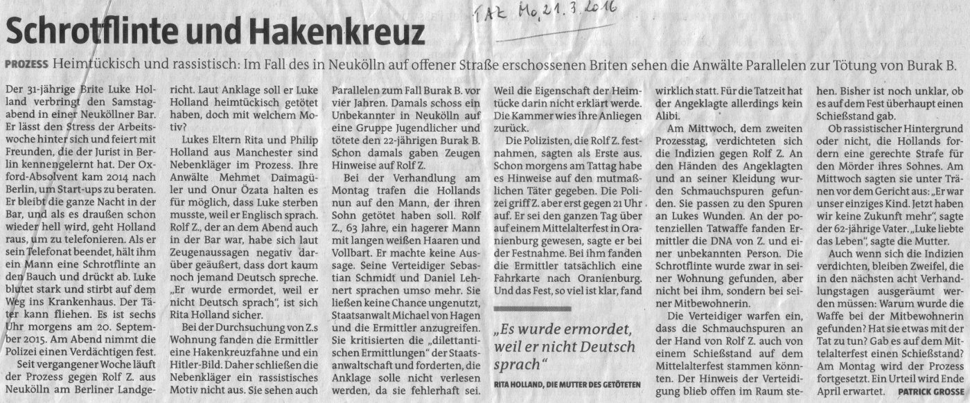 Seit dem 14. März 2016 wird vor dem Landgericht Berlin der Prozess gegen den 63-jährigen Rolf Z. geführt. Er wird beschuldigt, am 20. September 2015 Luke Holland (31 Jahre, Brite) in Berlin-Neukölln mit einer Schrotflinte aus nächster Nähe ermordet zu haben. Die Initiative für die Aufklärung des Mordes an Burak Bektaş beobachtet den Prozess und zieht nach den ersten vier Verhandlungstagen eine kritische Zwischenbilanz: