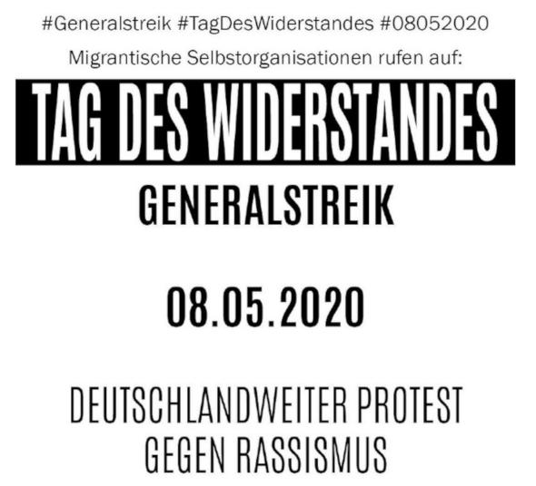 Der 8. Mai ist eine Mahnung und ein Versprechen im Hier und Jetzt, die Betroffenen rassistischer, rechter und antisemitischer Gewalt, ob in Hanau, auf dem Mittelmeer oder in Moria nicht alleine zu lassen. Wir rufen auf gemeinsam zu gedenken, zu trauern und uns gegen die Faschisten von heute im Verfassungsschutz, in der Bundeswehr, an der Grenze, in der Polizei, in der AFD, in Schulen oder Supermärkten, in Ost oder West, einzusetzen!