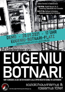 20.09.2021 | 17 Uhr | Eugeniu-Botnari-Platz am S+U Lichtenberg (Ausgang Weitlingstraße) | Antifaschistische Kiezdemonstration „In Gedenken an Eugeniu Botnari – Nazis raus aus dem Kiez!“