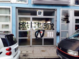 Von Sonntag auf Montag den 24. August wurde das Haus des Breite Straße Besitzers und das zuständige Architekturbüro in der Bernstorffstraße angegriffen. An die Wand wurde “Breite Straße” und das Besetzungs-Symbol gesprüht. Die Scheiben wurden mit Steinen eingeworfen und Farbe flog gegen die Fassade. Flyer mit folgendem Text wurden auf die Straße geworfen: