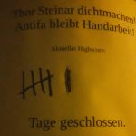 Wir haben am 21.10.2019 den Thor Steinar Laden in der Dortmunder Innenstadt besucht. Mithilfe von 400 ml Buttersäure und einem Feuerlöscher voll Bitumen wurde der Laden für eine Woche geschlossen.