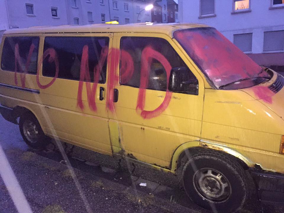 Laut diversen Meldungen in sozialen Netzwerken wurde der Lautsprecher-Wagen der NPD Westpfalz von Unbekannten großflächig beschmiert. So beschwert sich die Truppe um Ricarda Riefling und Markus Walter bei Facebook: