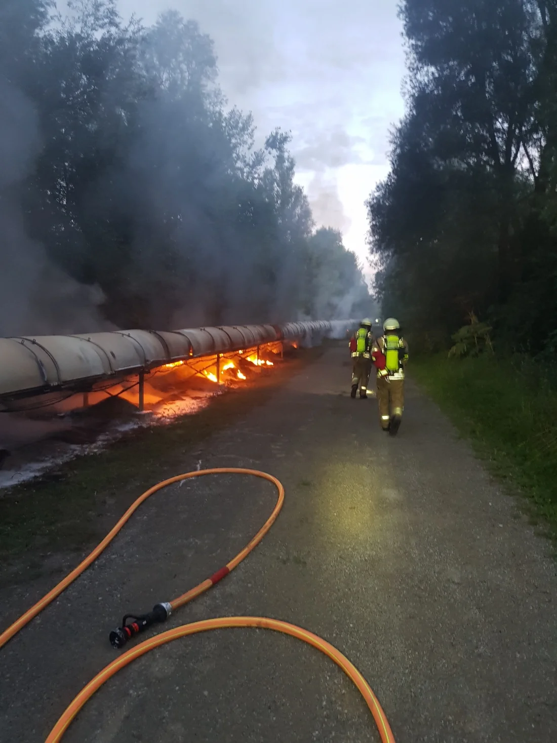 Ein Zeuge hatte gegen 4.30 Uhr starken Rauch aus dem an der Fürstenrieder Straße in Planegg gelegenen Werksgelände aufsteigen sehen und die Polizei alarmiert. Als eine Streife dort eintraf, brannte die Förderanlage bereits lichterloh. Der Brandgeruch zog bis ins nahe Gräfelfing. Die größten Herausforderungen für die Feuerwehren waren nach deren Angaben neben der starken Rauchentwicklung die teilweise schwierige Zugänglichkeit des Förderbands sowie die Wasserversorgung an der Einsatzstelle. Das feuchte Wetter der vergangenen Tage half den Brandbekämpfern – das Feuer konnte sich wegen der Nässe kaum auf die umliegenden Freiflächen, auf Pflanzen oder Bäume ausbreiten.