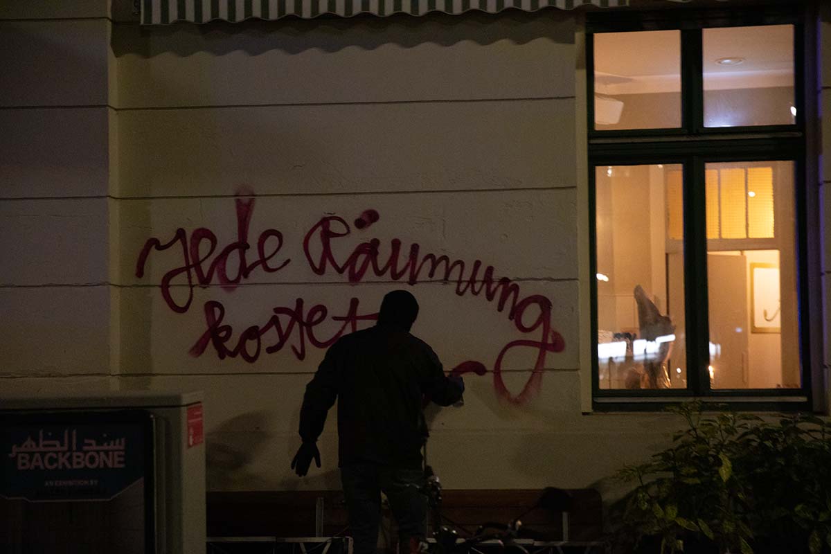 Bereits in der Nacht vom 14. zum 15. Oktober 2021 beschmierten Unbekannte in der Ritterstraße insgesamt elf Fahrzeuge mit Farbe und zerstörten ihre Seitenscheiben. An einem angrenzenden Gebäude soll laut Zeugenaussagen zudem eine Gruppe von rund 20 bis 30 Personen mehrere Fensterscheiben beschädigt und ebenfalls mit Farbe beschmiert haben. Unbekannt gebliebene Personen zündeten an der Kreuzung Ritterstraße Ecke Lobeckstraße pyrotechnische Gegenstände. An der Friedrich-Ebert-Stiftung in der Hiroshimastraße beschädigten weitere Unbekannte zudem mehrere Fensterscheiben. Im Umfeld stellten Polizeieinsatzkräfte später Schriftzüge mit Bezug zur geplanten Räumung, unter anderem auch an einem Fahrzeug, fest.