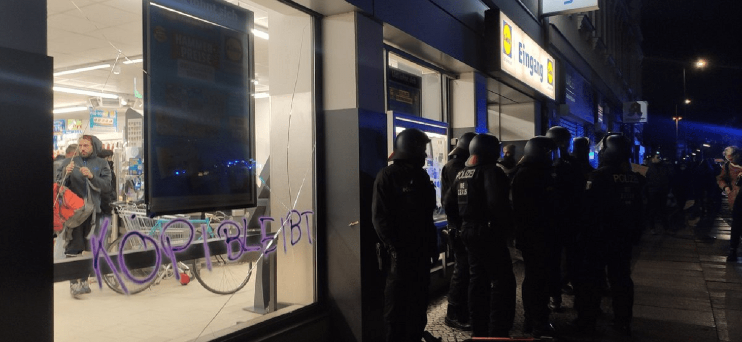 Unter dem Motto „Köpi bleibt! – Keine Räumungen in Berlin“ versammelten sich ab 20 Uhr am Kottbusser Damm mehrere hundert Personen zu einem angezeigten Aufzug. Die Zahl der Teilnehmenden wuchs im Verlauf des Abends auf einen höheren vierstelligen Bereich an. Der Aufzug war von Beginn an von einem hohen Aggressionspotenzial geprägt. Einsatzkräfte wurden massiv und fortlaufend mit Steinen und Flaschen beworfen sowie mit Stangen angegriffen. Zudem wurden im Verlauf der Wegstrecke diverse Sachbeschädigungen, vor allem an abgestellten Fahrzeugen, begangen und Pyrotechnik gezündet.