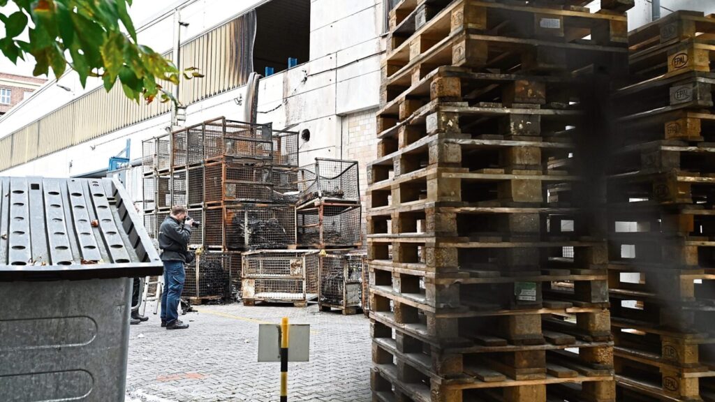 Auch die Metallpaletten wurden von den Brandstiftern angezündet. Die Flammen schlugen so hoch, dass das Gebäude dahinter beschädigt wurde. Der Sprecher weiter: „Fenster des Firmengebäudes wurden durch übergreifende Flammen aus den angesteckten Metallgitterboxen beschädigt.“