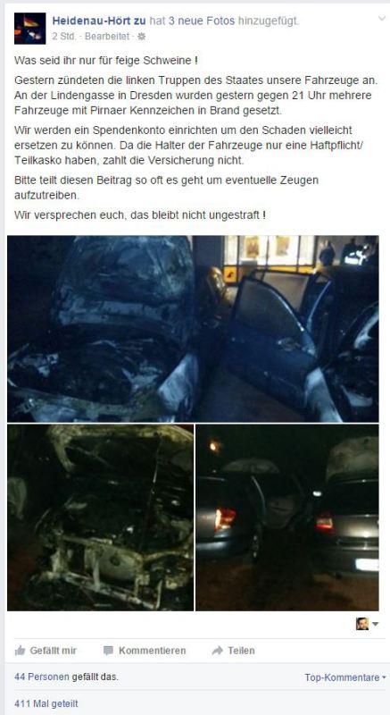 Tornate dall’assemblea di PEGIDA, dieci persone stavano davanti alle loro auto completamente bruciate. Visto che le assicurazioni non risarciscono il danno, vogliono istituire un conto corrente donazioni.