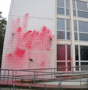 Wir schlossen uns daher einem Mob von ca. 60 Personen durch die Burgsdorfstraße zur Müllerstraße im Berliner Wedding an. Hier befindet sich die Landeszentrale der SPD und das Weddinger Jobcenter. Während am Donnerstag die Bullen jede Seitenstraße im Umfeld der Friedel zuparkten, konnten wir hier eine kostspielige Antwort auf die zurückliegende Räumung formulieren. Beide Gebäude büßten zig Scheiben ein, außerdem erhielt das Jobcenter noch massig Farbe, quasi als Zugabe für ihre tägliche Scheiße. Als Abschluss für den Abend und Vorgeschmack auf Hamburg wurden den anrückenden Bullenschweinen noch ein paar brennende Container auf die Straße gestellt.Friedel bleibt!