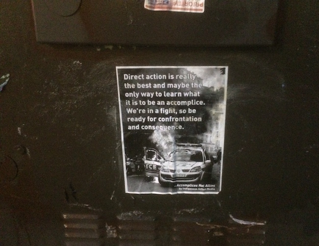 The march continued snaking around downtown Minneapolis, attracting a lot of attention from drivers and pedestrians and giving us an opportunity to hand out some flyers explaining the reason for the noise demo and the prison strike. More construction barricades were dragged in the street, windows were smashed, and when the police finally did manage to catch up with us a dumpster was hurled towards them and slowed their advance. When we finally arrived at the “Public Safety” building there were some bystanders already there who joined our chants and briefly joined the noise demo outside the adult jail, some of them dancing.
