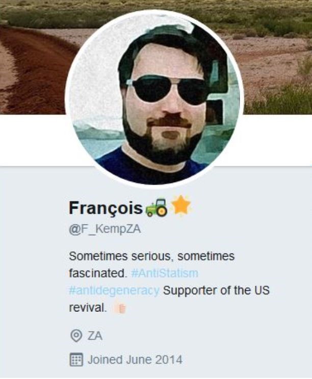 Francois Kemp (@/F_KempZA) is a neo-Nazi and member of the terrorist organization called The Base. Francois Kemp continues to use the alias “cempa” and lives in the Cape Town area in the province of Western Cape in South Africa.