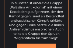 Aber auch in Münster, wo erneut die Gruppe „Palästina Antikolonial“ mit einem Redebeitrag aufgetreten ist, der den Kampf gegen Israel als Bestandteil antirassistischer Kämpfe erklärte und gegen Linke hetzte, die linken Antisemitismus ansprechen. Außerdem solidarisierte sich die Gruppe vor einigen Tagen nicht nur mit „Young Struggle“, sondern auch mit „Palästina Spricht NRW“, deren Auftreten auf der Hanau-Gedenkveranstaltung in Köln zurecht Kritik erfahren hatte (