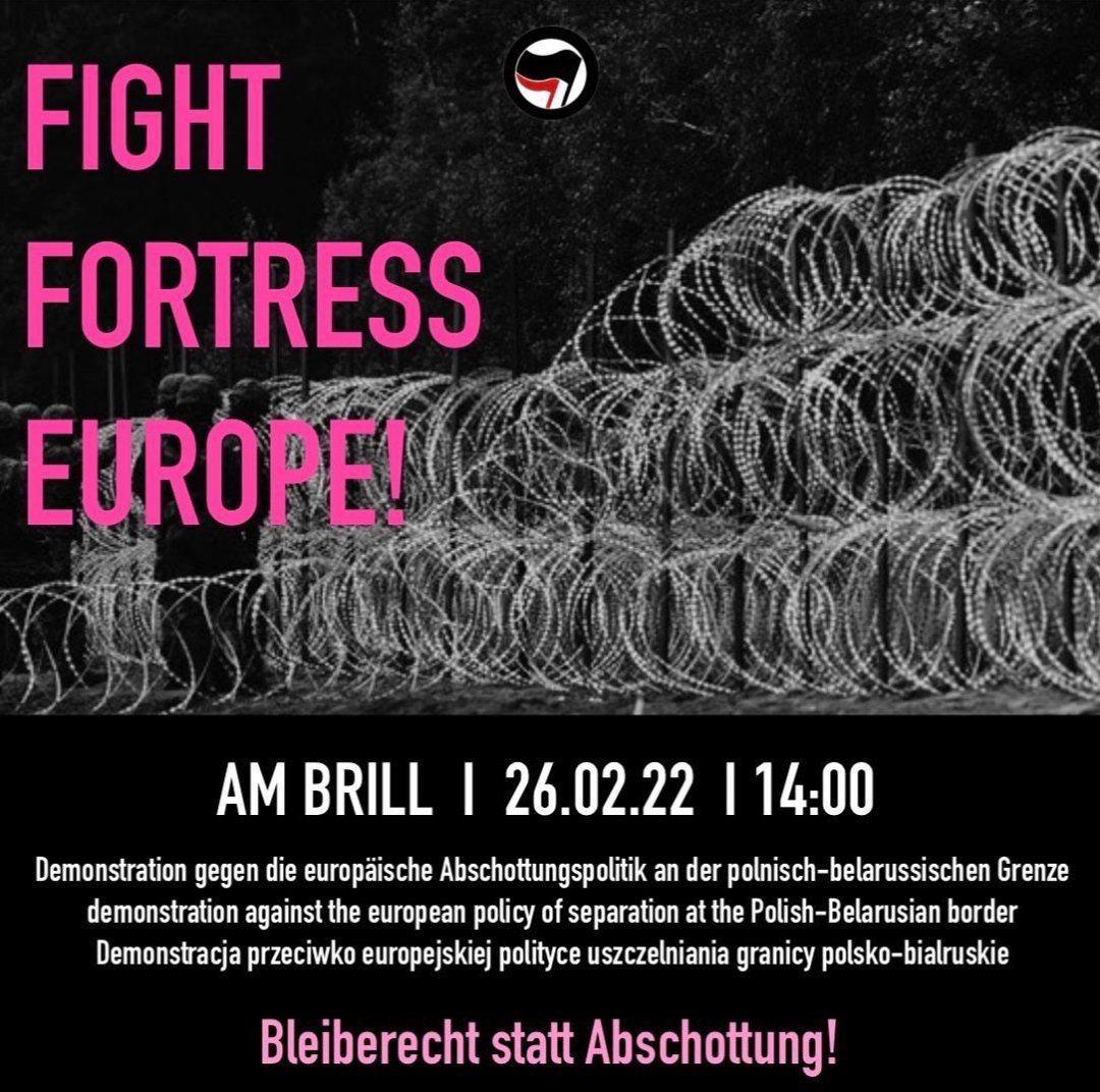 In Solidarität mit den Menschen die an der europäischen Außengrenze mit Gewalt gehindert werden die EU zu betreten und ermordet wurden, die in Auffanglagern unter menschenunwürdigen Bedingungen inhaftiert werden; Mut Wut und Hass auf dieses System und auf die europäische Union, die den systematischen und strukturellen Rassismus an seinen Außengrenze nicht fördert und fordert; Rufen wir auf: