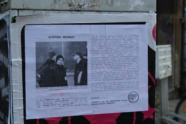 In der KTV verhielt er sich unauffällig. Auf der Straße war er selten zu sehen, meist führte ihn sein Weg nur schnell in den nahe gelegenen Netto oder in ein mit laufenden Motor wartendes Auto. Dies ist bereits das zweite Outing innerhalb gut einer Woche. Da traf es mit Danny B. einen Aktivisten der ‚Nationalen Sozialisten Rostock‘ (NSR). Mit Blick auf den Wahlkampf gehen Beobachter davon aus, dass sich derartige „Outingaktionen“ in Zukunft wiederholen werden. Vermutlich soll damit der Druck auf die organisierte Naziszene erhöht werden. Nach den Niederlagen bei den Blockaden in Greifswald am 1.Mai, der Mobilisierungspanne in Demmin (als Ordner mit dabei: Hannes Welchar) bei gleichzeitiger massiver Zunahme der Gegenaktivitäten, war die NPD eher in den Wahlkampf gestolpert. Anders als noch im Jahr 2006 fehlt der NPD auch die Proteststimmung und bisher ein aktuelles Aufregerthema. Gut möglich, dass die NPD den Wiedereinzug ins Schweriner Schloss verpasst, trotz des Ausbaus ihrer Strukturen in den vergangenen Jahren. Bei aktuellen Umfragen steht sie bei 3%.