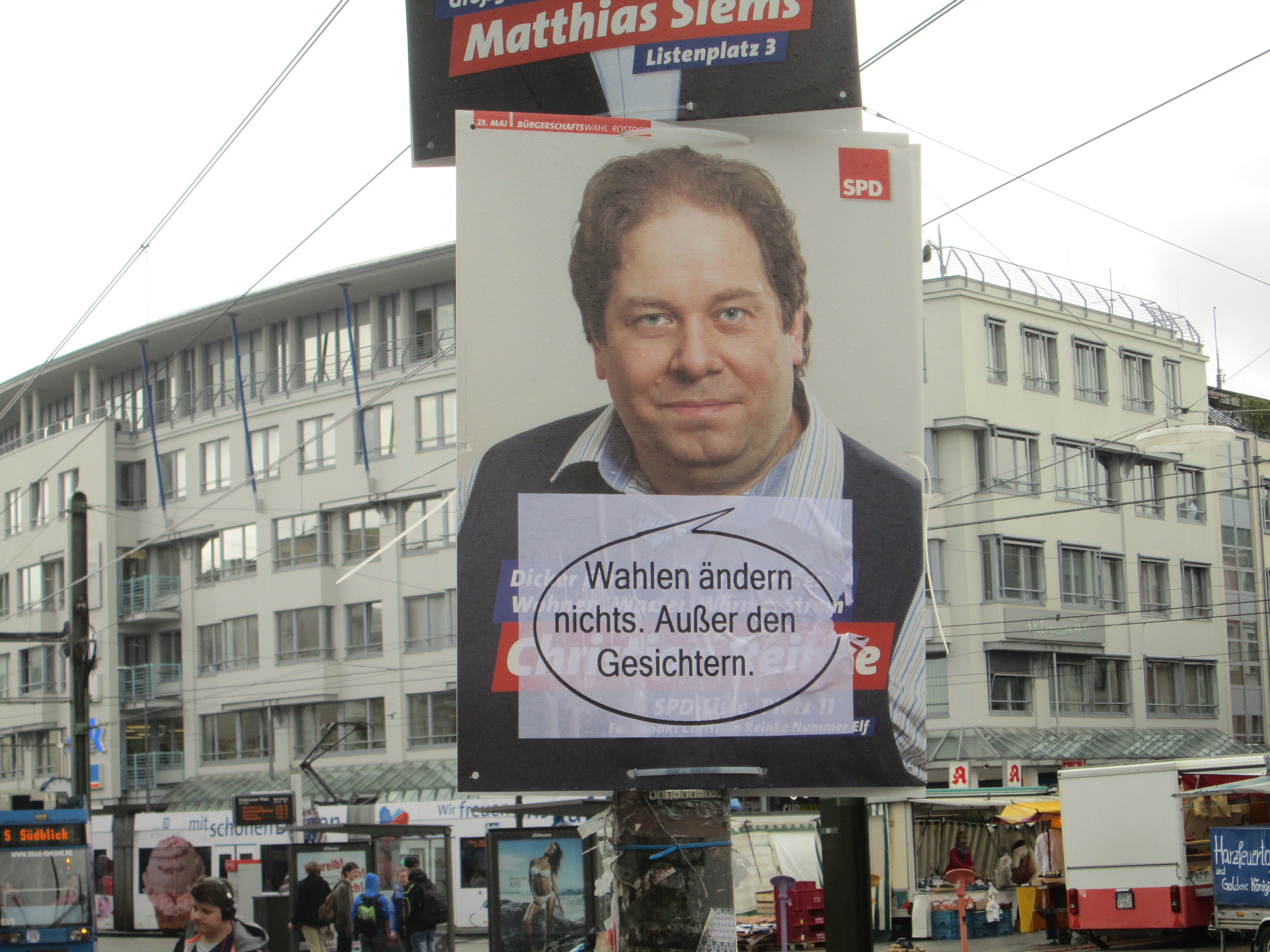 In der Nacht vom 11.5.2014 auf den 12.5.2014 hat sich eine bisher unbekannte KünstlerInnengruppe in das Finale des laufenden Europa-und Kommunal-Wahlkampf ungefragt eingemischt. Ihr Ziel waren dabei hauptsächlich die großen Wahlplakate im Rostocker Innenstadtbereich und rund ums Rathaus. Diese wurden mittels Farbe und Aufklebern zu politischen Kunstwerken umgestaltet. Laut ihrem Bekennerinnenschreiben hofft die Gruppe, den Angehörigen der Fraktionen, den MitarbeiterInnen der Stadtverwaltung und dem OB, die sich wie selbstverständlich jeden Tag einreden, alle anderen Menschen zu vertreten, ein paar neue Perspektiven auf ihre Politik aufzeigen zu können.