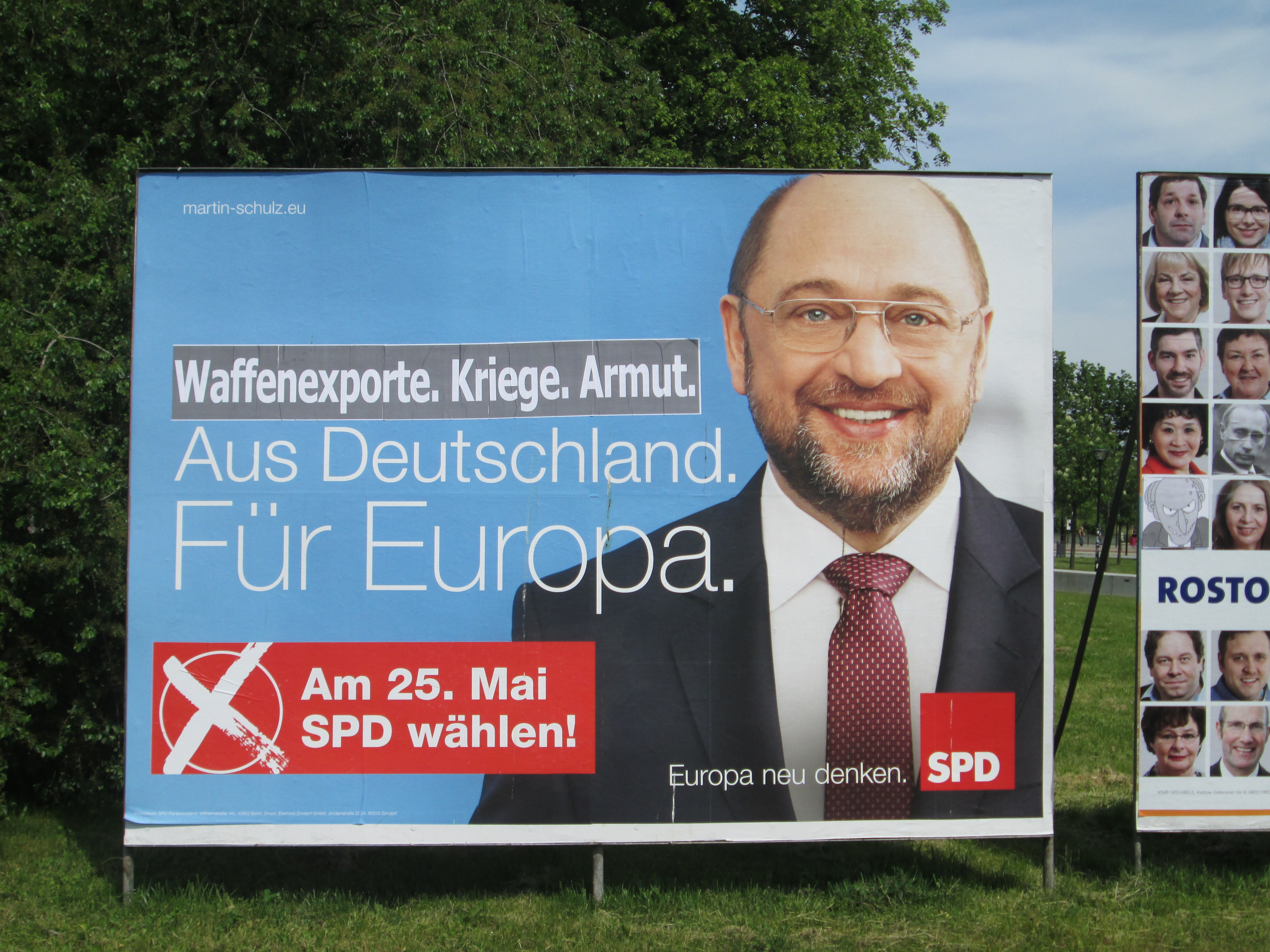 Stellvertretend der SPD lächelt nun Spitzenkandidat Martin Schulz freundlich zum Slogan „Waffenexporte. Kriege. Armut. Aus Deutschland. Für Europa.“ Besonders interessant ist dabei das Kommunalwahl-Motiv der SPD. Unter die Bilder der KandidatInnen hatten sich Darth Vader, Dieter Bohlen, Thilo Sarrazin, Gustav Noske, Pikachu, Vlad Putin, Merkel mit lustiger Brille und ein Totenkopf gemischt, während der Slogan von „Rostock entwickeln“ in „Rostock abwickeln“ verfremdet wurde.