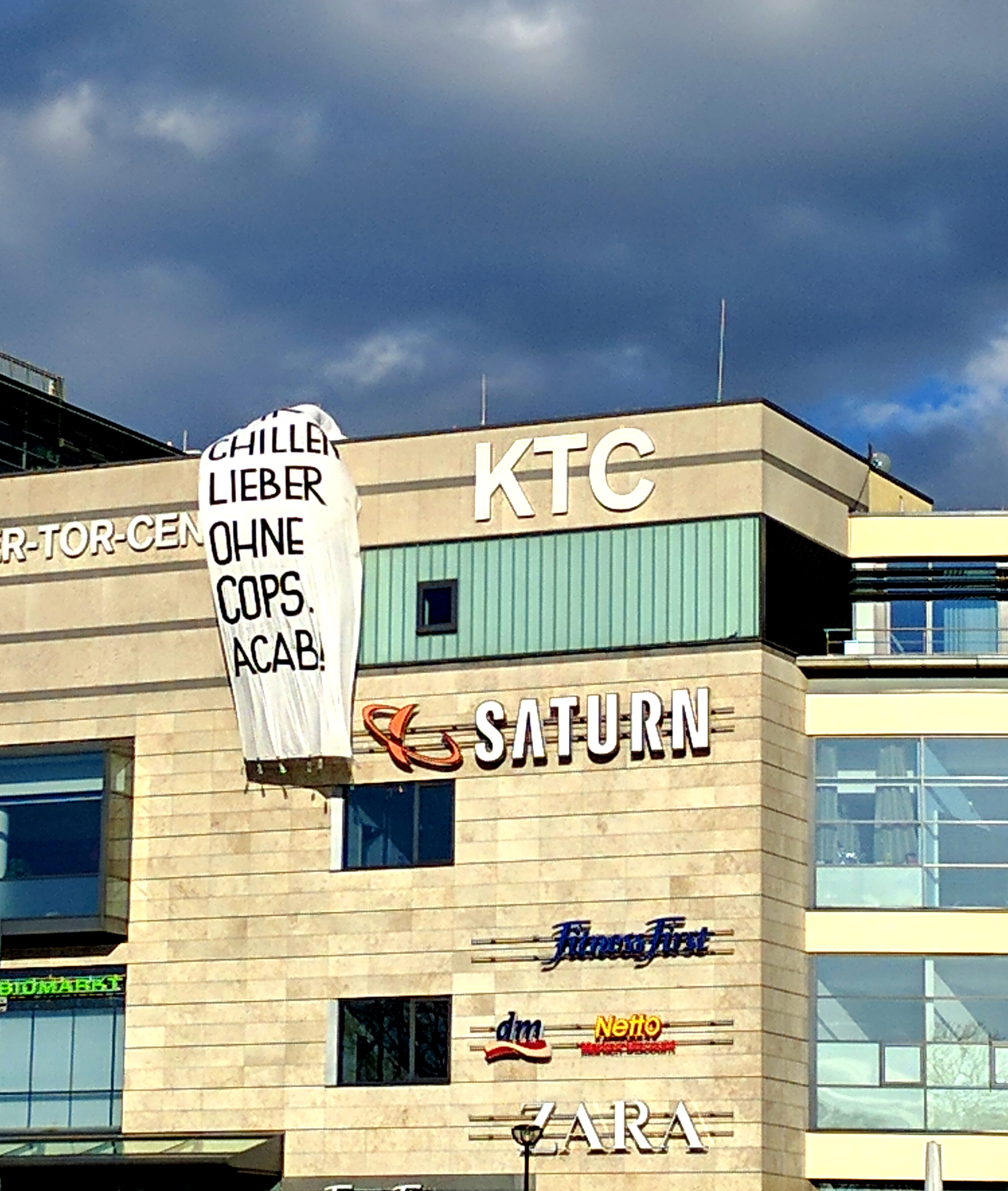 Weil uns Polizeipräsenz generell abfuckt, haben wir ein großes Banner mit der Aufschrift: „Wir chillen lieber ohne Cops. ACAB!“ vom KTC entrollt.