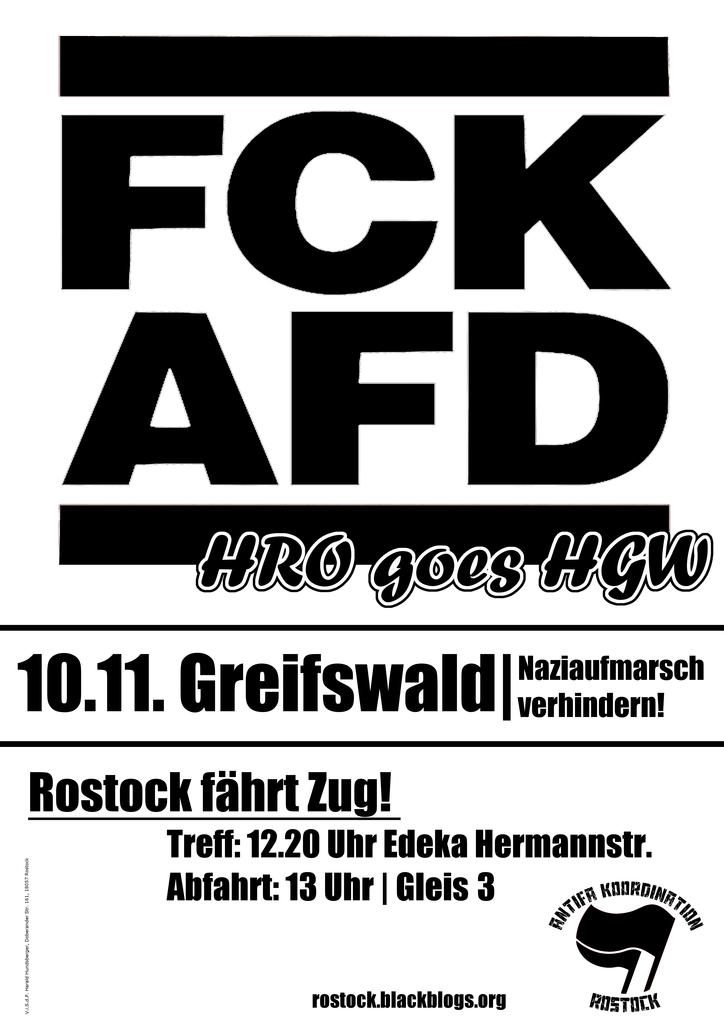 [Original erschienen unter https://de.indymedia.org/node/25719] Am 10. November wollen die Rassist*innen von AfD und Co. in Greifswald aufmarschieren. Das kennen wir in Rostock mittlerweile zu genüge. Die Genoss*innen aus Greifswald sind uns dabei oft zu Hilfe gekommen und haben uns in unseren Aktionen gegen die AfD unterstützt. Nun ist es Zeit den Spieß umzudrehen und praktische Solidarität mit den Antifas in Greifswald zu üben. Darum fahrt mit uns gemeinsam in die Stadt am Ryck.