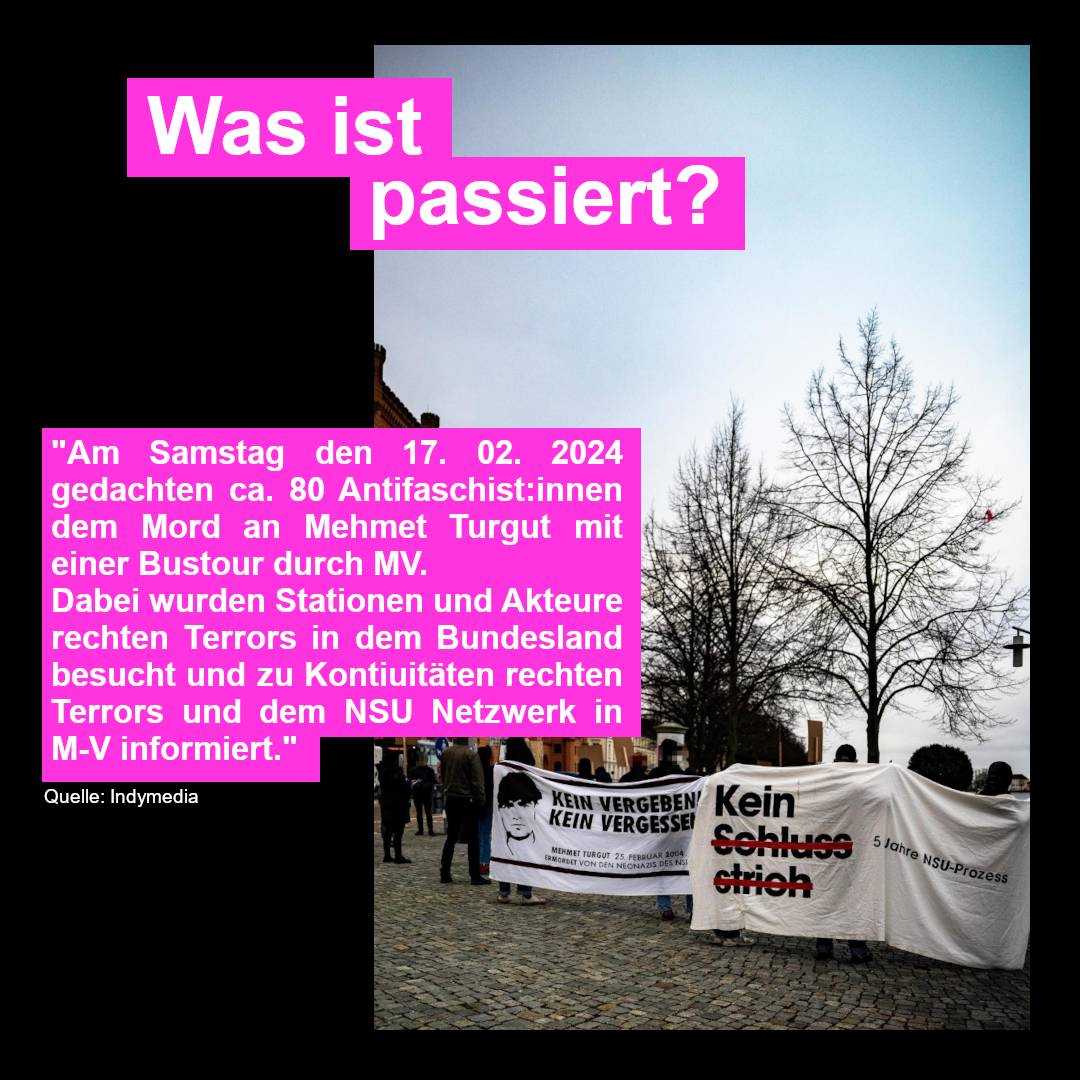 [Original erschienen unter https://de.indymedia.org/node/344020 ] Während rechte Politiker und Medien sich in den letzten Wochen darüber aufregten, dass im Zuge einer Bustour zum Mehmet-Turgut-Gedenken durch die Polizei „Waffen“ gefunden wurden, gedachten wir erneut den vielen Todesopfern rechter Gewalt. Egal ob in Hanau oder Rostock.