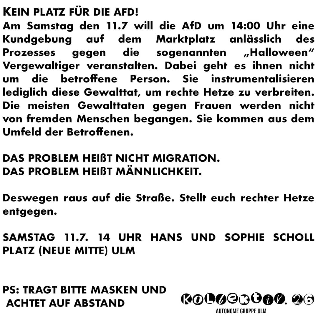 Die Forderungen werden gestellt von: Kollektiv.26 – Autonome Gruppe Ulm, Young and Queer Ulm e.V., Jusos Ulm, Grüne Jugend Ulm, Neu-Ulm, Alb-Donau, DIE LINKE Ulm / Alb-Donau, Mein „Ich“ gegen Rassismus