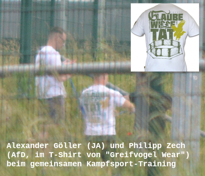 Von der AfD nehmen regelmäßig teil: Jörg Sobolewski, der ebenfalls IB-Aktivist ist und zur Burschenschaft Gothia gehört. Sobolewski ist früherer Leiter der Geschäftsstelle der AfD Berlin, danach war er Mitarbeiter im Bundestag und bei der AfD Fraktion in der BVV Friedrichshain-Kreuzberg. Neben ihm nimmt Philipp Zech am Training teil. Er war 2019 und 2020 Vorstand der AfD Charlottenburg-Wilmersdorf, ist Exmitglied der Piratenpartei und Sportwissenschaftler an der Uni Potsdam, der auch Vorträge für die Aidshilfe hält. Beim Training trat auch er mit einem T-Shirt der Neonazimarke “Greifvogel Wear” auf. Ebenfalls dabei ist Alexander Göller von der Jungen Alternative Berlin und AfD Kreisverband Reinickendorf, der auf Facebook mit NS-Sprache auffällt.