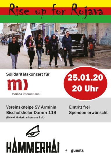 Bei aller Freude an der Musik und ausgelassener Feierei wird es auch kurze Wortbeiträge zu der aktuellen Lage in Nordsyrien geben. Die Spenden, die mit dem Konzert gesammelt werden sollen, werden ein kleiner Beitrag zur humanitären Hilfe in der aktuellen, katastrophalen Lage sein. Sie gehen an die Hilfsorganisation medico international, die mit dem Spendenaufruf „Hilfe für Rojava“ für ihre Arbeiten sammelt.