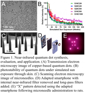 La idea consiste en utilizar un parche con unas microagujas (escala milimétrica 1,5×0,3) que inyecten los DOT’s bajo la piel (artículo original https://2019.biomaterials.org/sites/default/files/abstracts/210.pdf ), las agujas introducen los DOT al descomponerse. Los DOT usados eran coloidales, de 4nm y un núcleo de cobre (muchos DOT suelen ser de Cd que es tóxico) y con un pico de emisión de 886nm en el infrarrojo cercano.