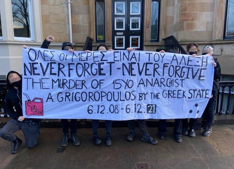 An-diugh, 6/12/2021, tha e air a bhith 13 bliadhnaichean on a mharbh stàit na Grèige an t-anargaiche, Alexis Grigoropoulos. Chaidh loisgeadh air Alexis le dithist phoileasman, E. Korkoneas agus V. Saraliotis, ann an sgìre Exarchia, às dèidh comhstrì ghoirid leis a’ phoileas. Cho luath ‘s a chaidh an naidheachd air murt Alexis mun cuairt, thòisich ar-a-mach neo-uallaichte. Bha caismeachdan, aimhreitean, goidean agus for-ghlachdaidhean de thogsalaich phoblach am measg nam freagairt air an fheirg a bh’ aig daoine. A dh’aoindeoin gach oidhrip leis an stàit agus leis a’ chalpa gus am murt a dhèanamh neo-phoilitigeach, feumaidh cuimhne bhith againn gur ann air sgàth a bheachdan politigeach a chaidh Alexis a mharbhadh – bha e na dhùbhlan ann an dà-rìribh do dh’ùghdarras a’ phoilis agus – mar sin – na stàite. Is e seo am fòirneairt a sheasas an aghaidh na feadhainn anns nach faic an stàit luach sam bith, na feadhainn a tha nam bagairt air an òrdugh acasan.