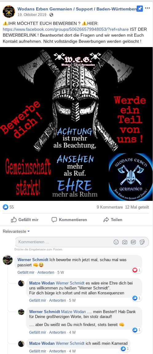 Auf seinem Facebookprofil finden sich in der Freundesliste Thomas Lohr, Markus Wodanssohn, Andi Odin, Daniela Kremerius, Frank Holl und Mike Schattmann. Alles Admins der Wodans Erben Facebookgruppe. Außerdem alles Freunde von Werner Somogyi, der nicht mal 180 Freunde auf Facebook hat.