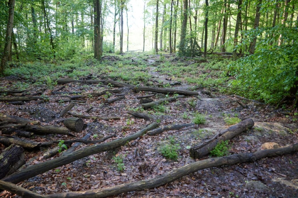 Die Spuren durch die Räumung & Rodung sind heute noch unverkennbar. Der Einsatz schwerer Maschinen führt zwangläufig zu verdichteten Waldboden, der sich nicht regeneriert.
