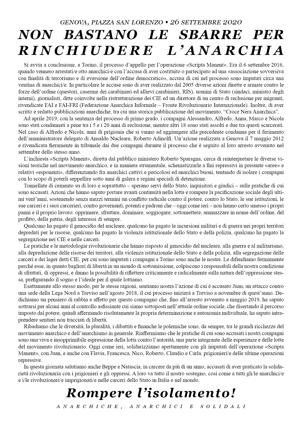 ITALIEN: DIE GITTERSTÄBE REICHEN NICHT AUS, UM DIE ANARCHIE EINZUSPERREN. SOLIDARITÄTSINITIATIVE MIT DEN ANARCHIST*INNEN DIE WEGEN DER OPERATION „SCRIPTA MANENT“ VOR GERICHT STEHEN (GENUA, 26.09.2020)